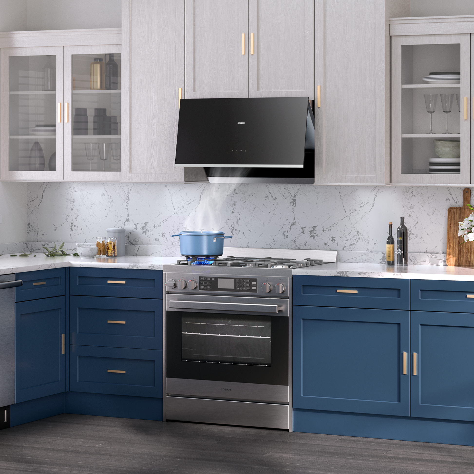 这款30英寸黑色壁挂式抽油烟机整齐地安装在橱柜下方,外观简洁流畅。光滑的玻璃表面可用软布轻松擦拭干净。